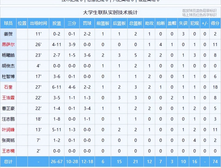 石奎18分3板2助、叶润峰11分2板1助、昂萨尔11分1板1助4断、王浩霖10分3板2帽、杨曦皓8分5板2助2断、杜智博6分