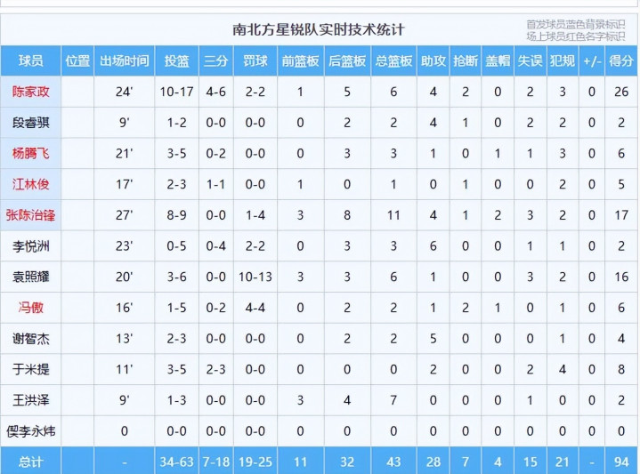 数据:陈家政26分6板4助2断、张陈治锋17分11板4助2帽、袁照耀16分6板、于米提8分2助、杨腾飞6分3板、冯傲6分2断、江林俊5分、谢智杰4分2板5助、王洪泽2分7板、李悦洲2分3板6助、段睿骐2分2板4助;