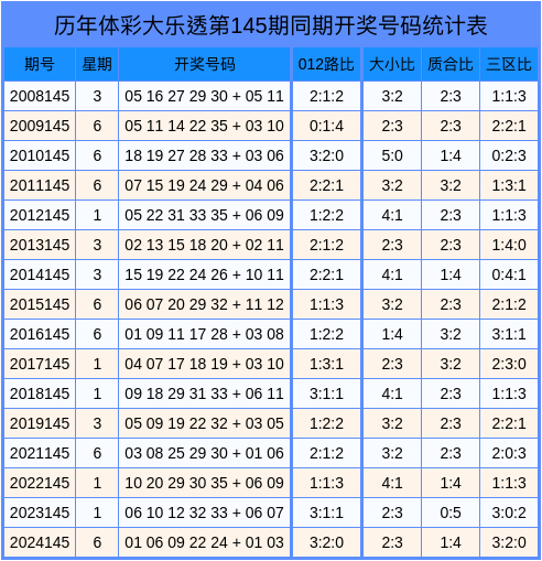 其中前区的012路比为1:2:2,三区比为3:2:0,大小比为1:4、质合比为3:2。