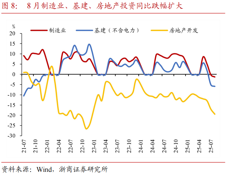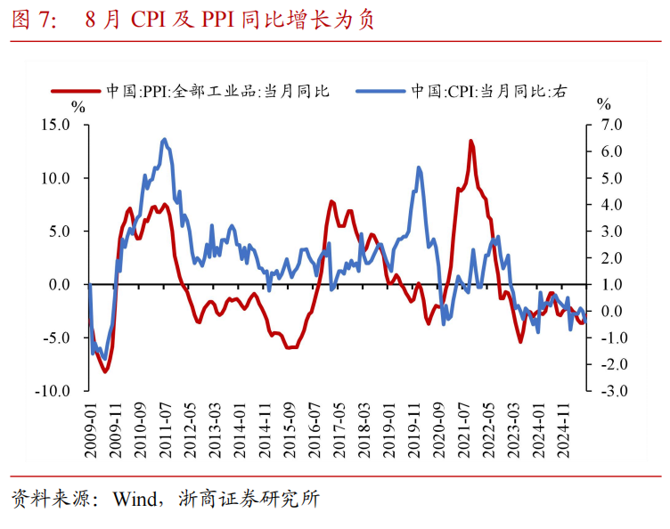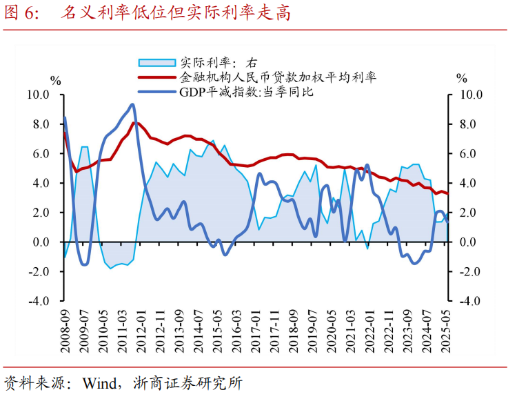 通胀预期偏弱,大幅降息或导致实际利率走高继而一定程度上抑制消费及投资。以(贷款加权平均利率-GDP平减指数)作为实际利率的衡量指标,当前名义利率虽处历史低位,但CPI、PPI同比仍在0附近甚至为负(2025年8月PPI当月同比-2.90%,CPI当月同比-0.40),GDP平减指数走低(2025年Q2为1.36%),实际利率不降反而走高(2025年Q2上升至1.93%),形成“越降名义、实际越高”的悖论。大幅降息或强化通缩预期,进一步抑制消费和投资,对稳增长形成负面效应,因此央行或许不会一次性大幅降息。