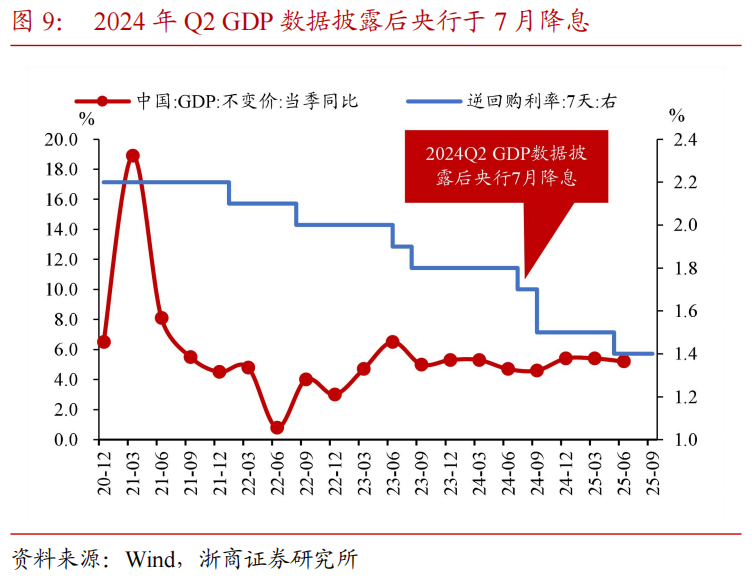 落脚到货币宽松的节奏上,我们认为2024年7月降息以促进稳增长或对当前具有一定参考意义。在2024年7月16日披露的二季度GDP走弱(同比增速4.70%,较一季度环比下降0.6%)背景下,第二十届中央委员会第三次全体会议于7月15日至18日召开,之后一周央行宣布降息。若2025年10月披露的三季度GDP及信贷数据延续走弱,10月四中全会召开后,稳增长压力加大,后续政策利率可能出现一定幅度下调。