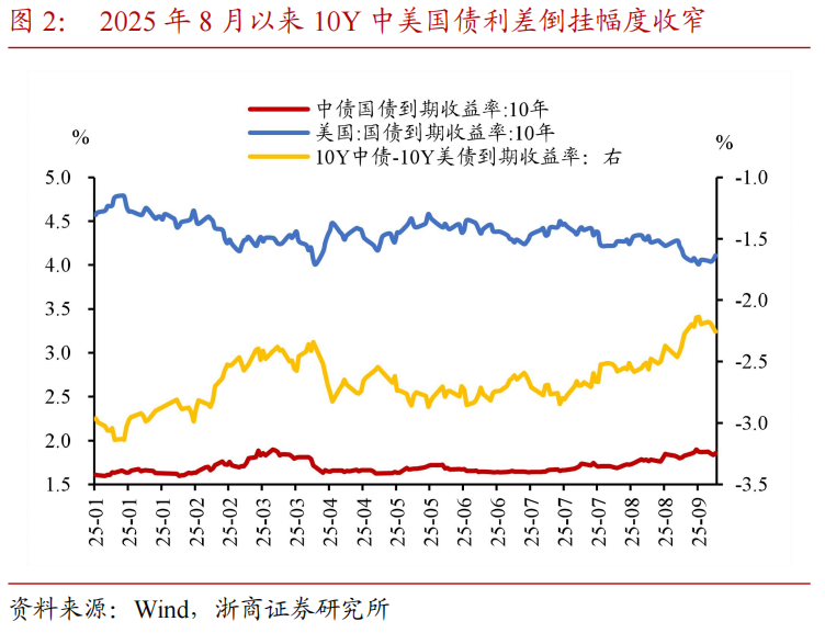 2025年7月中旬以来,美国就业数据走弱,美联储降息预期逐步强化,因而中美利差倒挂幅度收窄,资金外流风险下降,为国内央行货币宽松创造了一定窗口。低利率环境下中美利差较长周期处于倒挂状态,而自7月中旬以来,10Y中美国债利差倒挂幅度显著收窄,从7月17日的-2.81%附近收窄至9月18日的-2.26%附近,使境外资本套利空间缩小,跨境资金流出压力缓解,从而减轻人民币进一步贬值压力并降低外部金融风险,为国内货币政策宽松创造更充裕的操作空间。