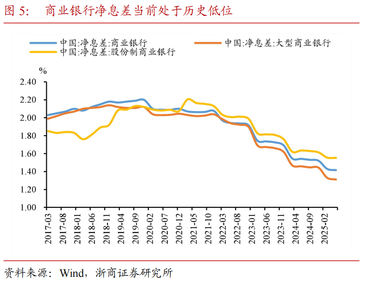 2.内部仍有约束:银行息差低位+实际利率上行。当前降息仍然面临“银行净息差低位+实际利率上行”的双重约束。商业银行净息差已降至历史低位,若再进一步单边下调贷款基准利率,银行盈利与信贷投放意愿可能进一步受挫,故央行对全面降息或更为谨慎。通胀预期偏弱,大幅降息或导致实际利率走高继而一定程度上抑制消费及投资。