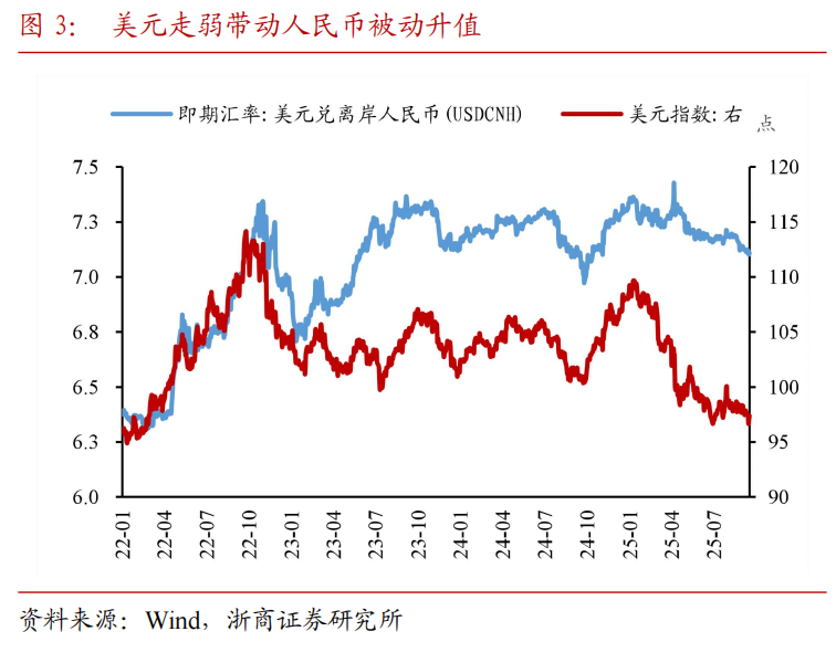 1.外部掣肘减弱:“腾挪空间“打开。2025年7月中旬以来,美国就业数据走弱,美联储降息预期逐步强化,因而中美利差倒挂幅度收窄,资金外流风险下降,为央行货币宽松创造了一定窗口。美元走弱带动人民币被动升值,结汇需求回升,境内流动性环境边际改善,降息空间打开。汇率压力减轻,但仍需防止“人民币快速升值→出口竞争力下降”的副作用,因此央行降息存在一定必要性。