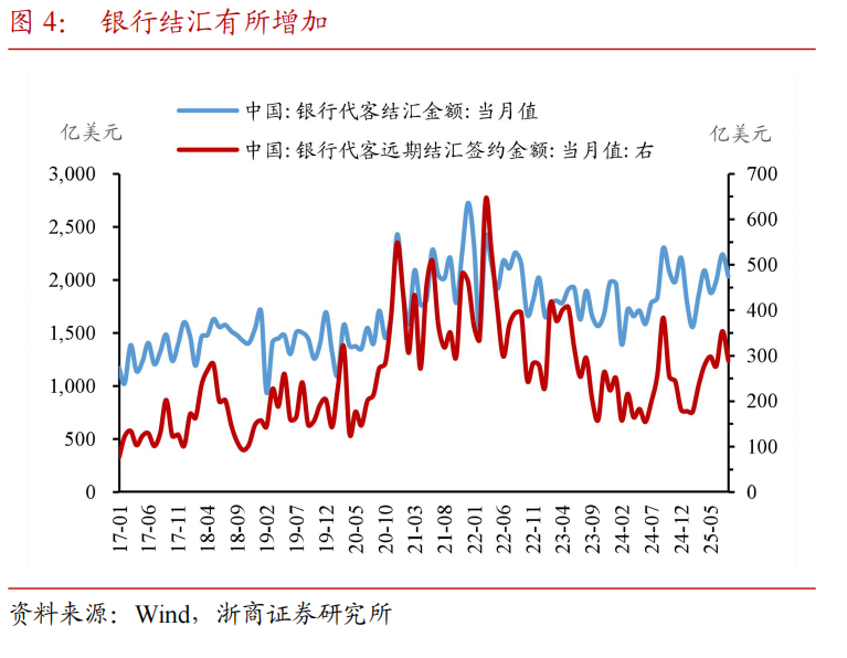 美元走弱带动人民币被动升值,结汇需求回升,境内流动性环境边际改善,降息空间打开。随着美联储降息预期走强,美元指数走弱,从7月末的100点附近下降至9月18日的97点附近。美元走弱带动人民币被动升值,继而提升了出口企业结汇意愿,2025年8月银行代客结汇金额约2032亿美元,较上半年明显增长,且远期结汇签约金额同样增长明显。结汇需求提升有助于为债市创造良好的流动性宽松环境,而人民币汇率稳中有升为央行进一步降息打开了空间。