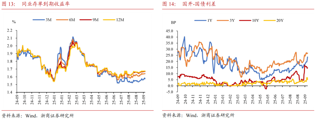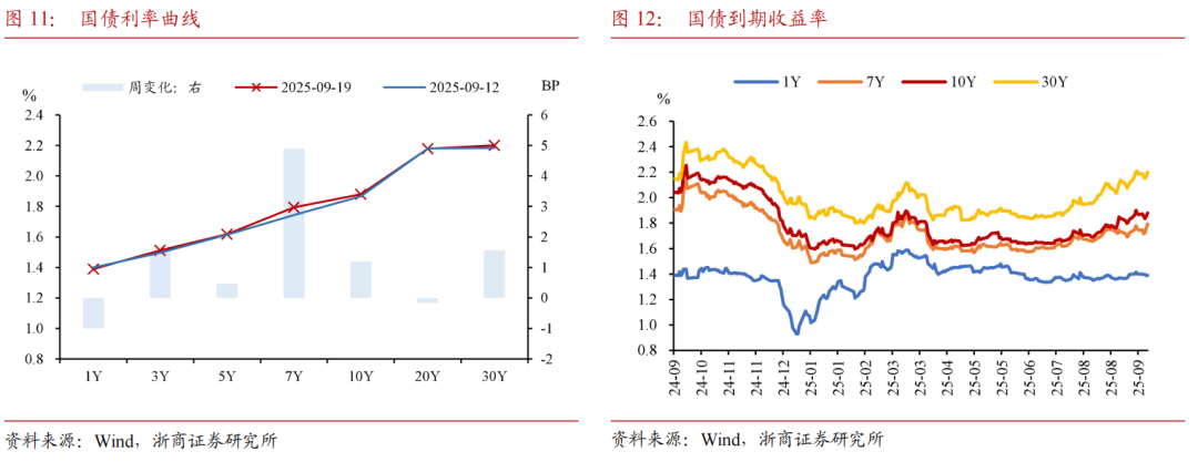 过去一周(2025年9月15日-2025年9月19日)央行货币宽松预期强化,10年国债利率呈现“N”字型。9月15日,债市在反内卷预期下利率小幅上行;9月16日、17日,投资者对央行重启买债预期较强,各期限品种利率全线下行,10年国债利率由9月16日高点1.81%附近下行至9月17日低点1.76%附近,下行幅度达5BP;9月18日美联储降息25基点,上证指数冲高至接近3900点后回落,10年国债利率走势偏震荡,小幅上行。9月19日债市超预期调整,10年国债利率上行1.25BP。整周来看,权益市场对债市影响已逐步弱化,投资者对央行宽货币预期有所强化,10年国债利率呈现“N”字型走势。