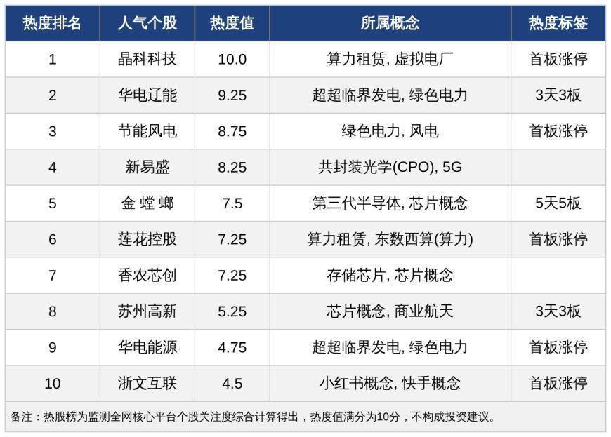 今日,A股十大人气热股如下:晶科科技、华电辽能、节能风电、新易盛、金螳螂、莲花控股、香农芯创、苏州高新、华电能源、浙文互联。