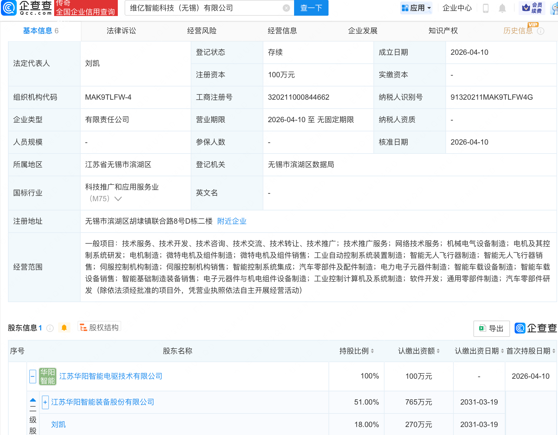 企查查APP显示,近日,维亿智能科技(无锡)有限公司成立,经营范围包含:智能无人飞行器制造;智能无人飞行器销售;伺服控制机构制造;伺服控制机构销售;智能控制系统集成等。企查查股权穿透显示,该公司由华阳智能(301502.SZ)旗下江苏华阳智能电驱技术有限公司全资持股。