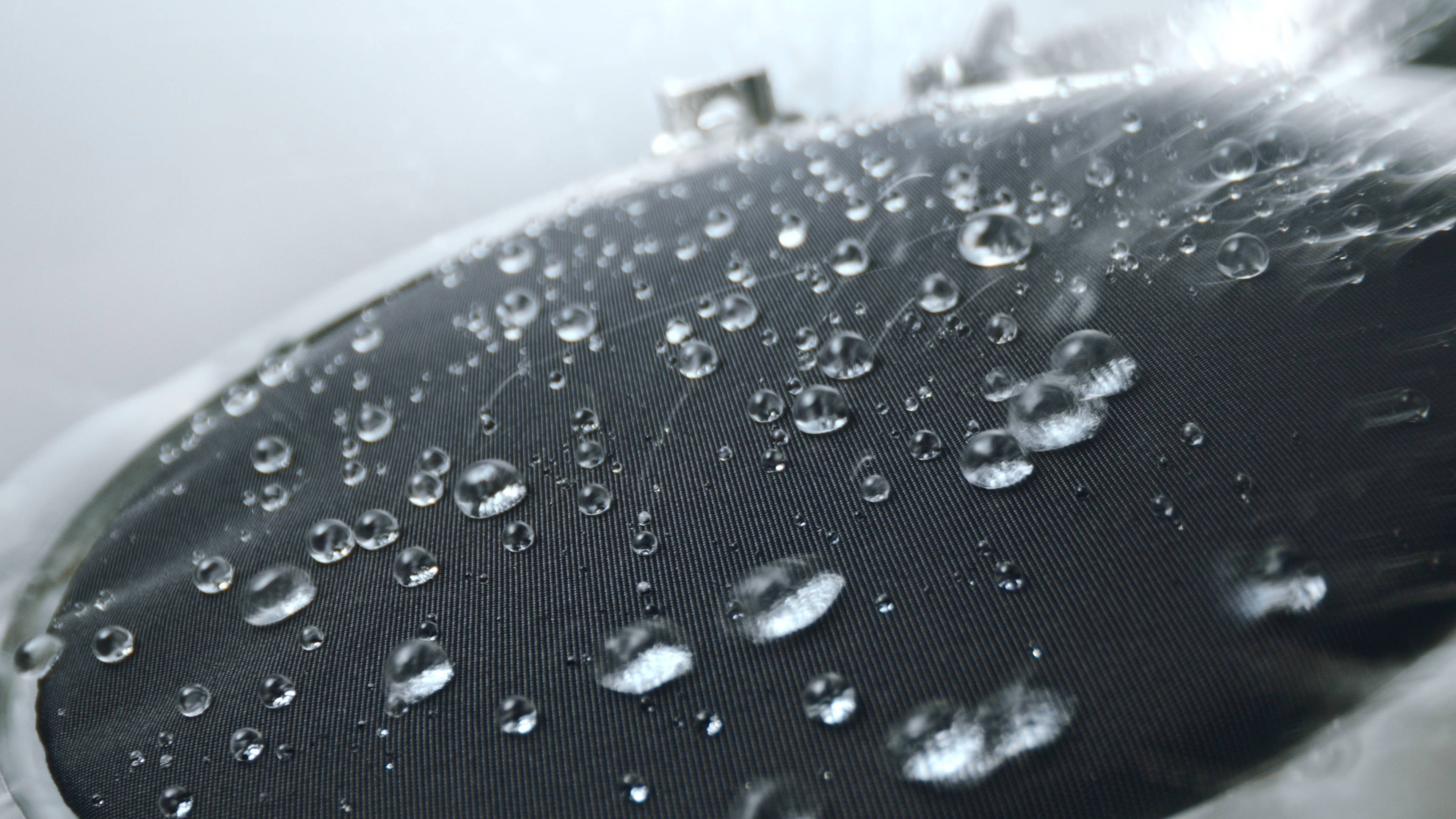 防水“第一岗”,是位于面料表层的疏水涂层,这也是冲锋衣防水的“关键岗”。雨水落到衣服上,会“丝滑”滑落下去,“水不沾衣”主要因为它。