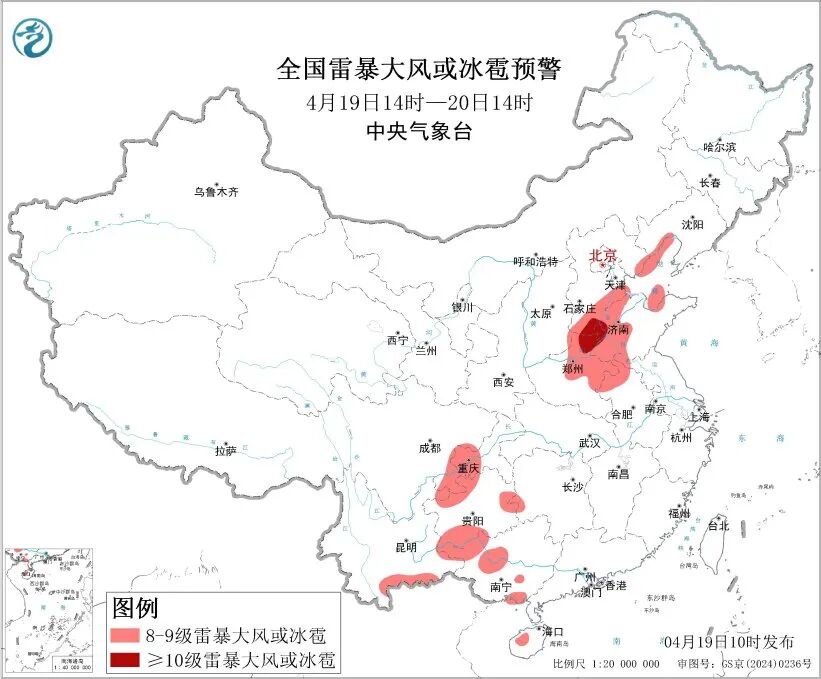 预计4月19日14时至20日14时,华北东南部、黄淮中北部、西南地区东部和南部、华南西部等地的部分地区将有8级以上雷暴大风或冰雹天气,其中,河北东南部、山东西北部、河南东北部等地的部分地区将有10级以上雷暴大风,最大风力可达11级以上;华北东南部、黄淮中部、西南地区东部和南部、江南西部、华南西部等地的部分地区将有小时雨量大于20毫米的短时强降水天气,其中,湖南西北部、重庆东南部、贵州东北部等地的部分地区小时雨量大于50毫米,最大可达60毫米以上。