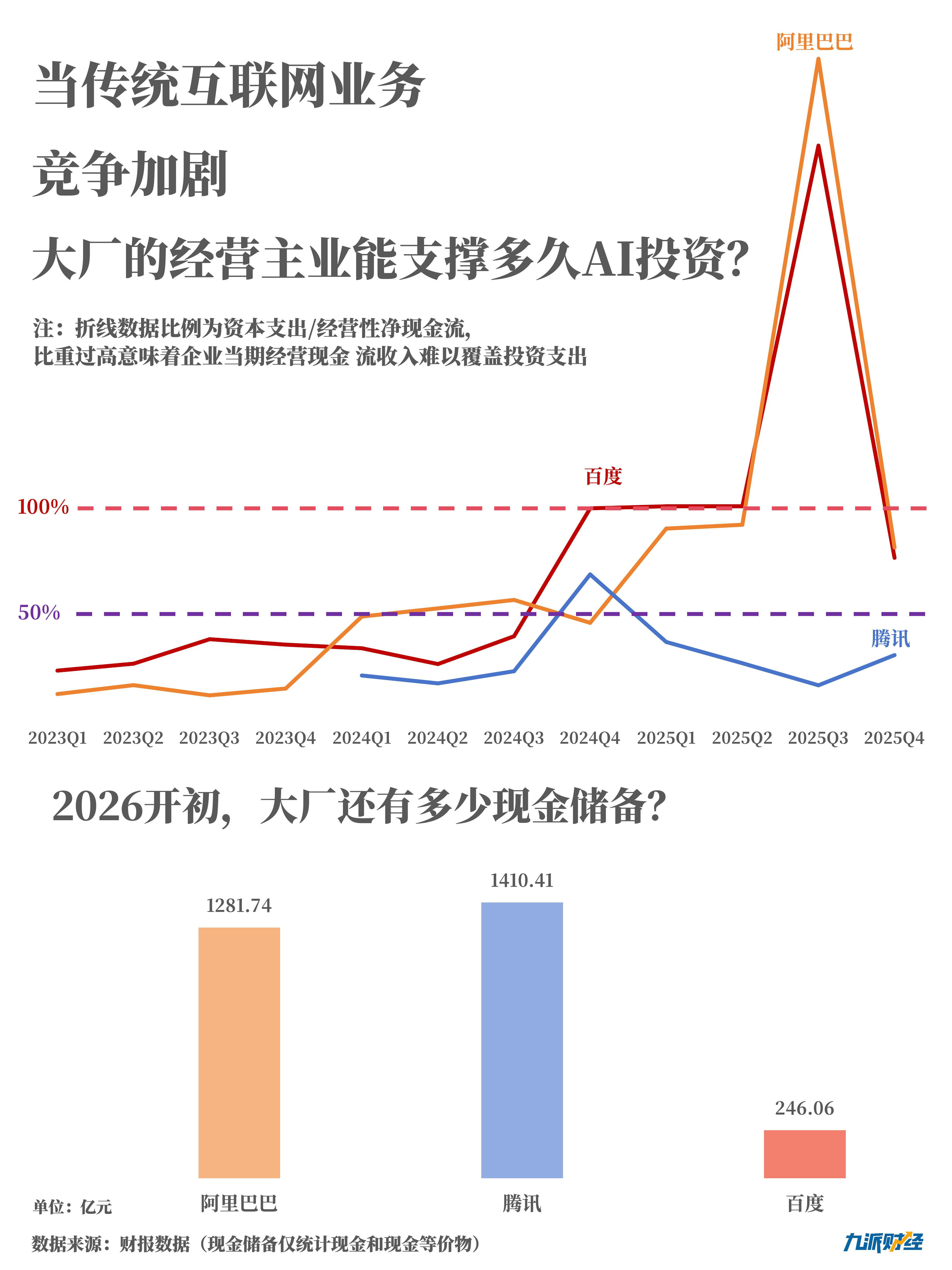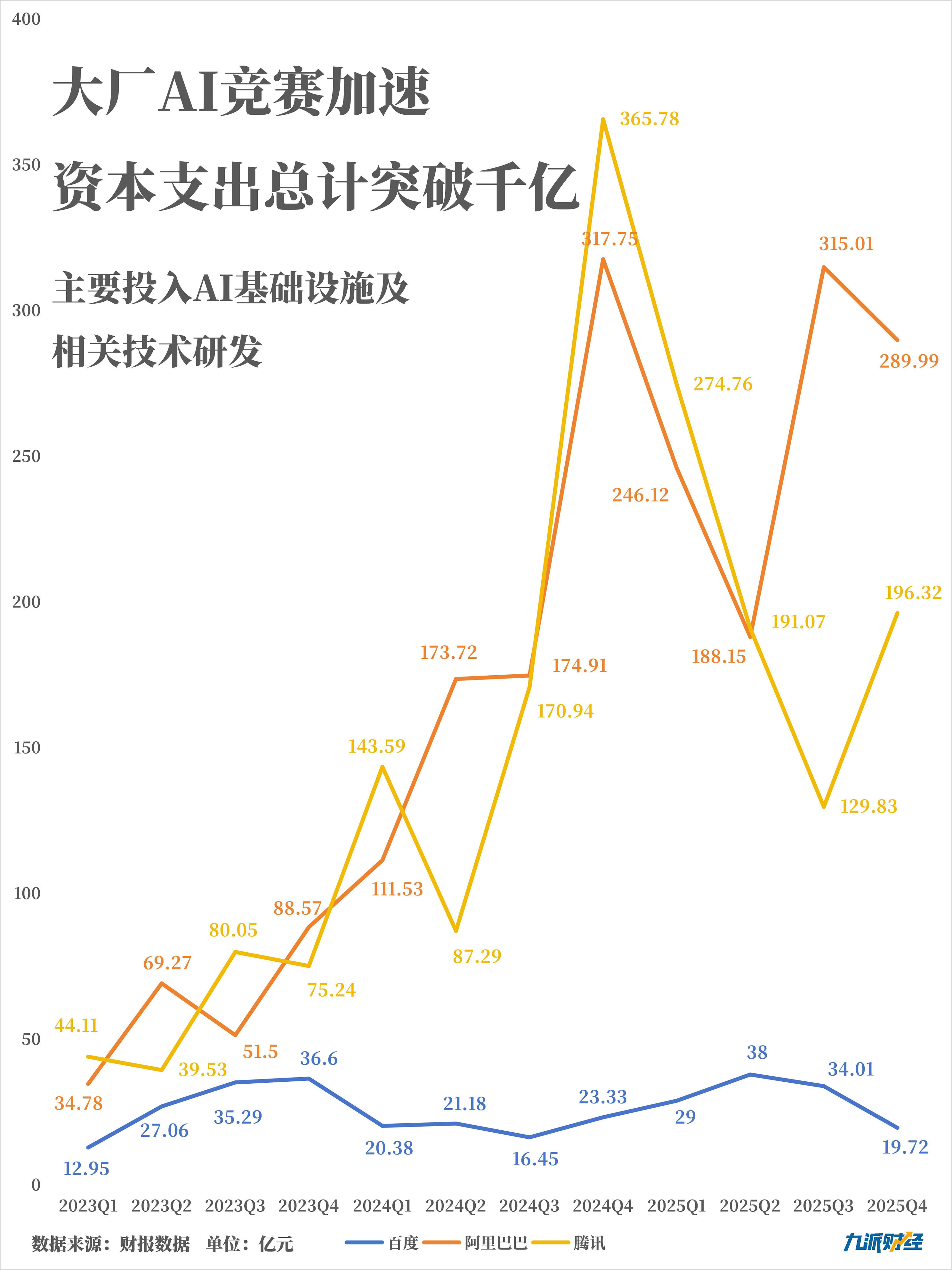 阿里、腾讯、百度三家大厂中,2025年阿里资本支出最高,数额突破千亿;腾讯次之,资本支出近800亿元,百度的投入则在百亿规模。