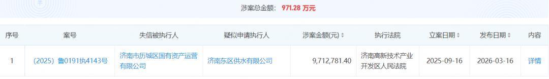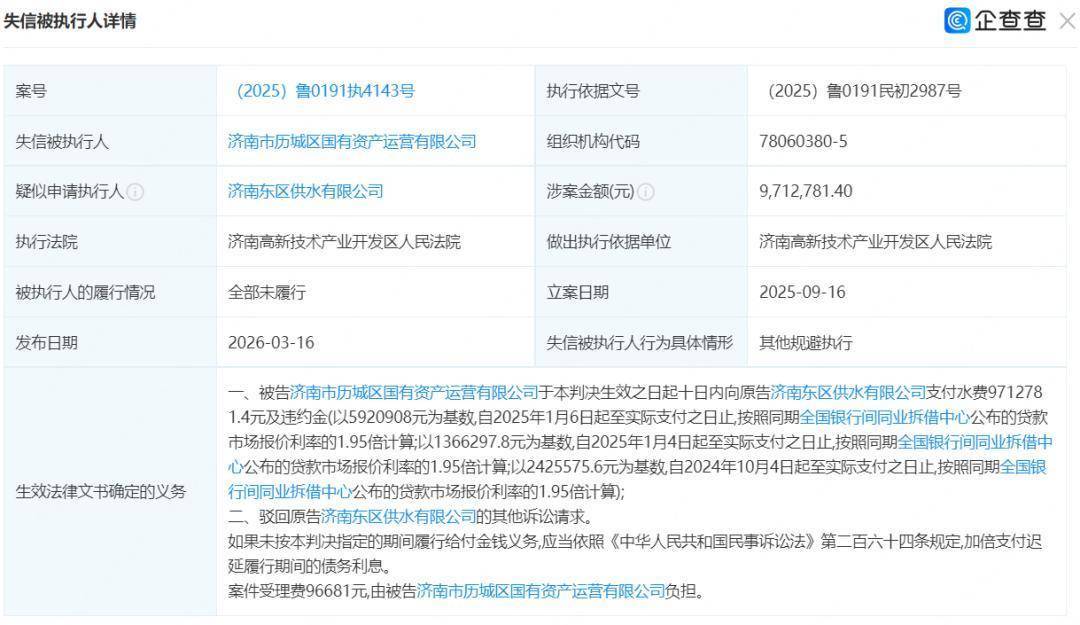 具体来看,执行法院为济南高新技术产业开发区人民法院,涉案金额约为971.28万元,具体判决为被告济南市历城区国有资产运营有限公司于本判决生效之日起十日内向原告济南东区供水有限公司支付水费9712781.4元及违约金。