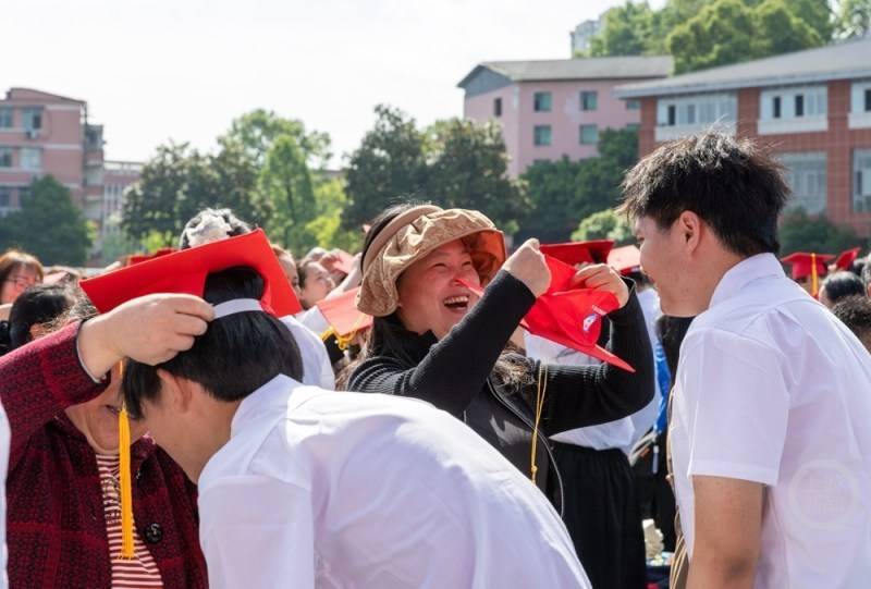家长为孩子佩戴成人礼帽。